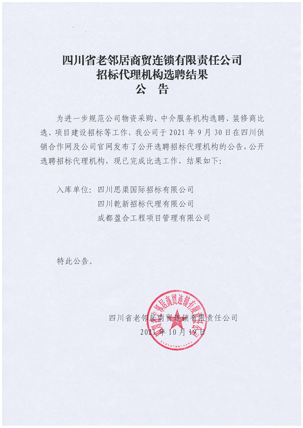 四川乾新招投標(biāo)代理有限公司受四川省老鄰居商貿(mào)連鎖有限責(zé)任公司的委托,擬對四川省老鄰居商貿(mào)連鎖有限責(zé)任公司2022